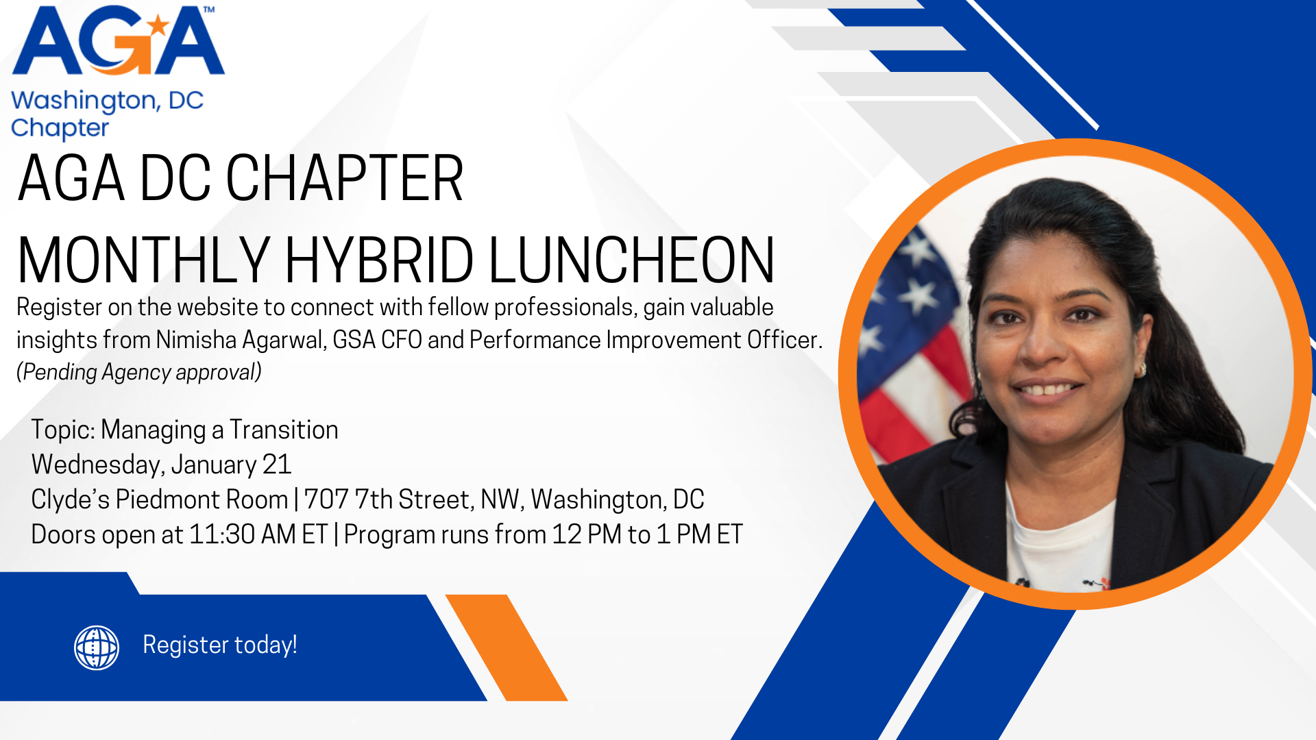 Join us to hear from General Services Administration (GSA) Chief Financial Officer and Performance Improvement Officer Nimisha Agarwal discussing the topic of “Managing a Transition” (Pending agency approval.)